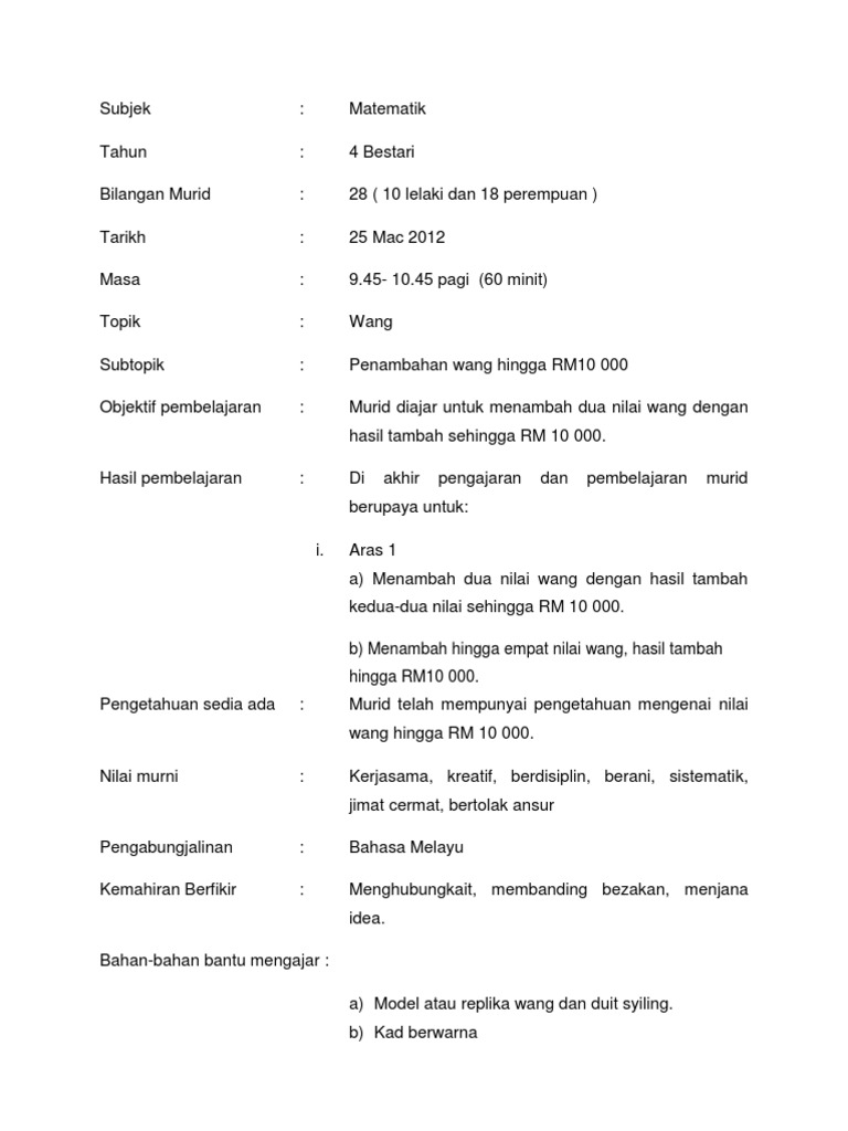 Rph Matematik Tahun 4 25 Mac 2012 Tambah Wang Pdf